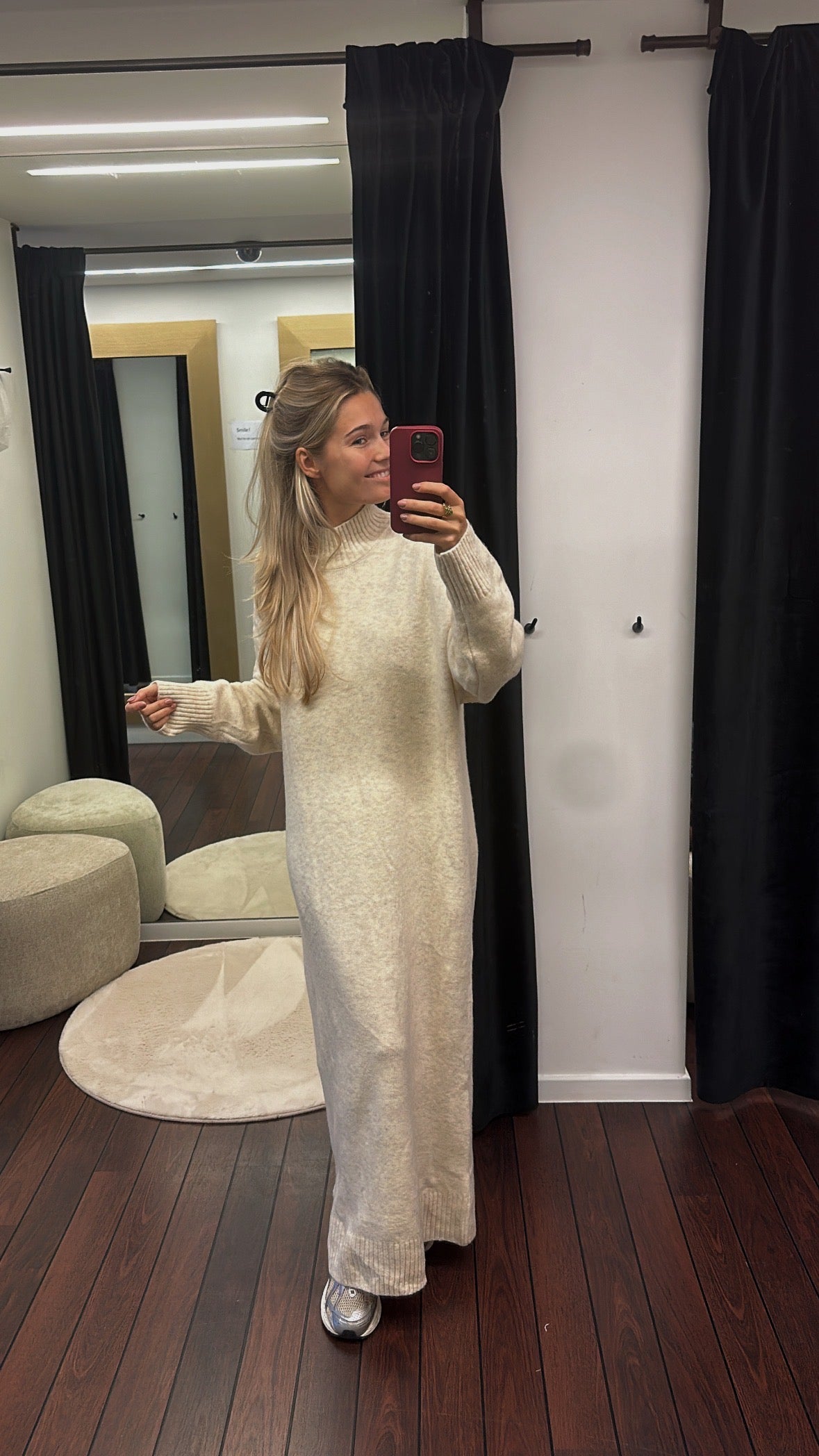 Basic long sweater dress in large, smooth knit. High collar with long sleeves. Chop finish.
